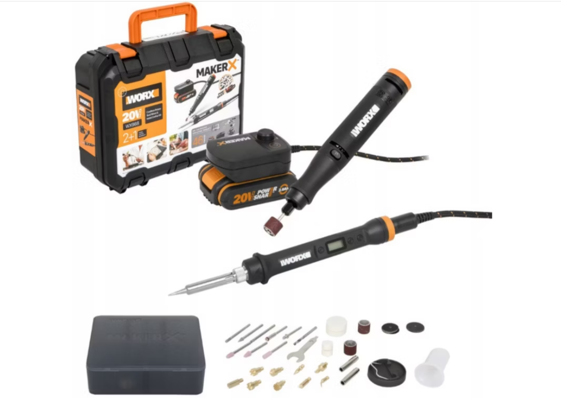 WORX WX988 MAKERX – це універсальний набір інструментів для любителів самостійного ремонту, моделювання та рукоділля. Він включає роторний інструмент і паяльник для дерева та металу, що дозволяє точно різати, шліфувати, полірувати, гравірувати та паяти. Його компактний та бездротовий дизайн означає, що ви можете використовувати його будь-де, без обмежень, пов'язаних з проводами. Вдосконалений безщітковий двигун забезпечує тривалий термін служби та високу продуктивність, а цифровий контроль температури паяльника дозволяє налаштовувати параметри для різних матеріалів. Пристрій сумісний із системою WORX PowerShare, що дозволяє використовувати акумулятор взаємозамінно з іншими інструментами тієї ж серії.