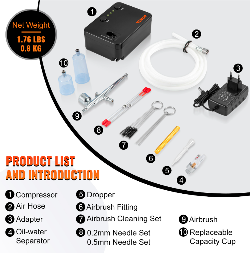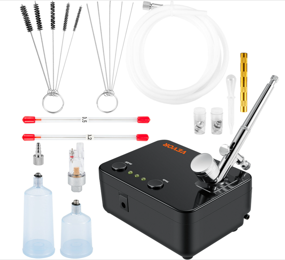 Завдяки зручній ручкі керування рідиною, регульованому факелу розпилення та змінному насадці для обслуговування, цей набір аерографа легко зібрати та використовувати користувачам будь-якого рівня. Незалежно від того, новачок ви чи професіонал, ви створюватимете чудові роботи в найкоротші терміни. У комплекті з комплексним набором для чищення цей набір широко використовується для розпису моделей, рукоділля, декорування тортів, обклеювання автомобілів, тимчасових татуювань, мистецтва, нейл-арту тощо! Приходьте та створюйте приголомшливі шедеври зараз!