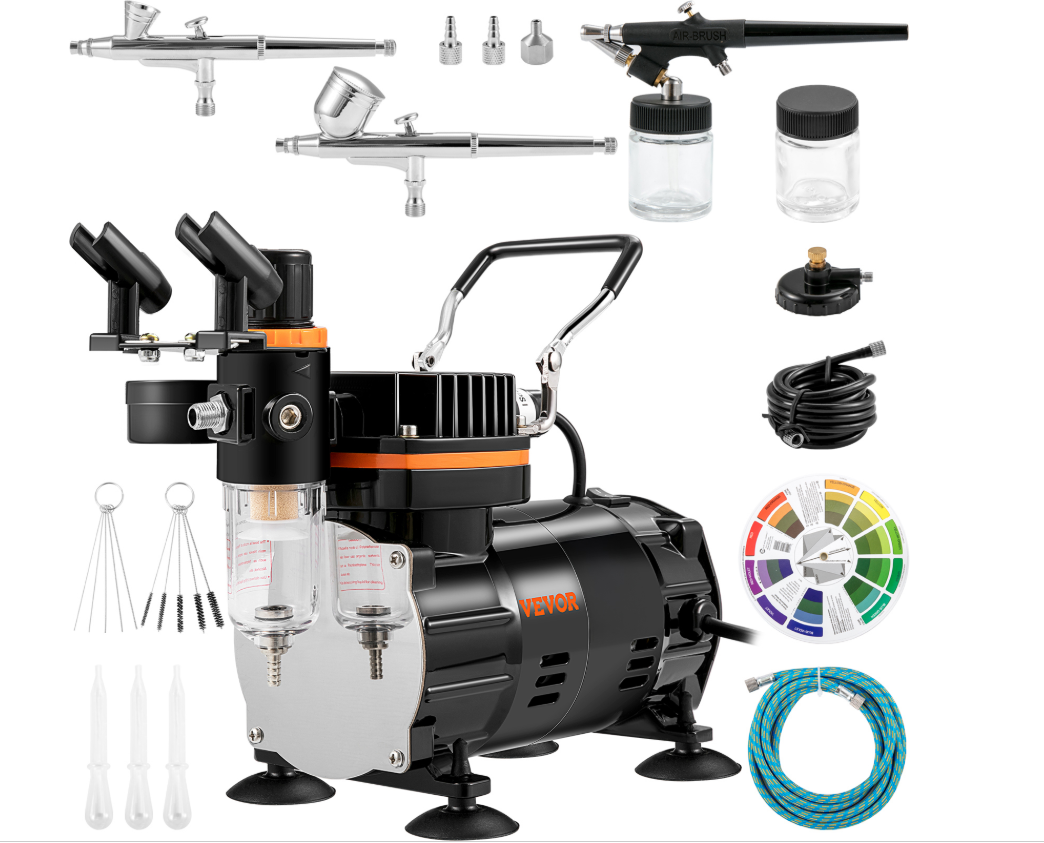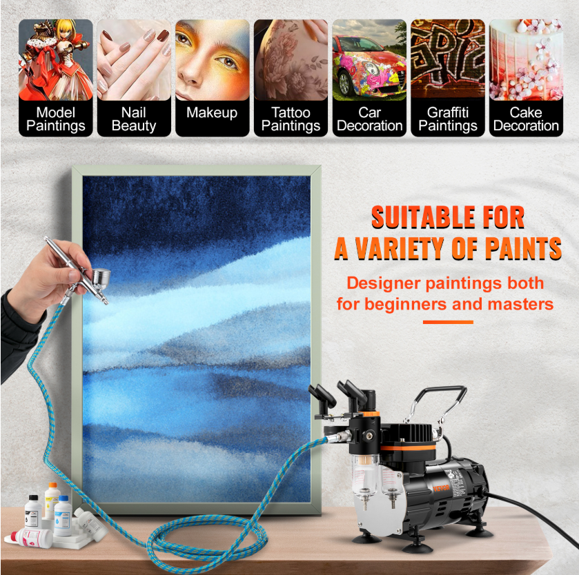 . Комплект аерографа — це легкий поршневий компресор із гравітаційною подачею та подвійною дією. Три різні знімні розпилювальні форсунки забезпечують різний ступінь розпилення та контролю для різних застосувань. Він ідеально підходить для проектів «зроби сам», автомобільної графіки, тимчасових татуювань, декорування тортів, мистецтва, нейл-арту тощо.