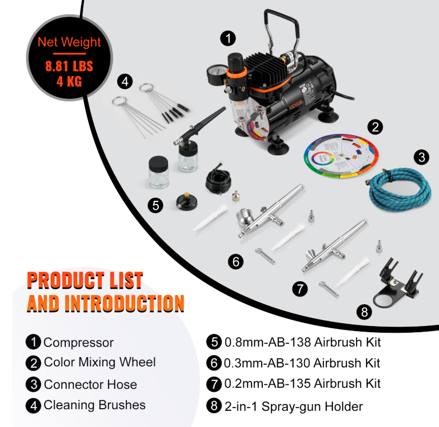 аксесуари: Включає три змінні аерографи (0,2 мм, 0,3 мм та 0,8 мм). Цей професійний набір не тільки задовольнить ваші різноманітні потреби в дрібній деталізації, але й впорається майже з усіма завданнями з фарбування невеликих поверхонь. Він ідеально підходить для моделювання, макіяжу, нейл-арту, графіті, одягу, розпису їжі тощо.
