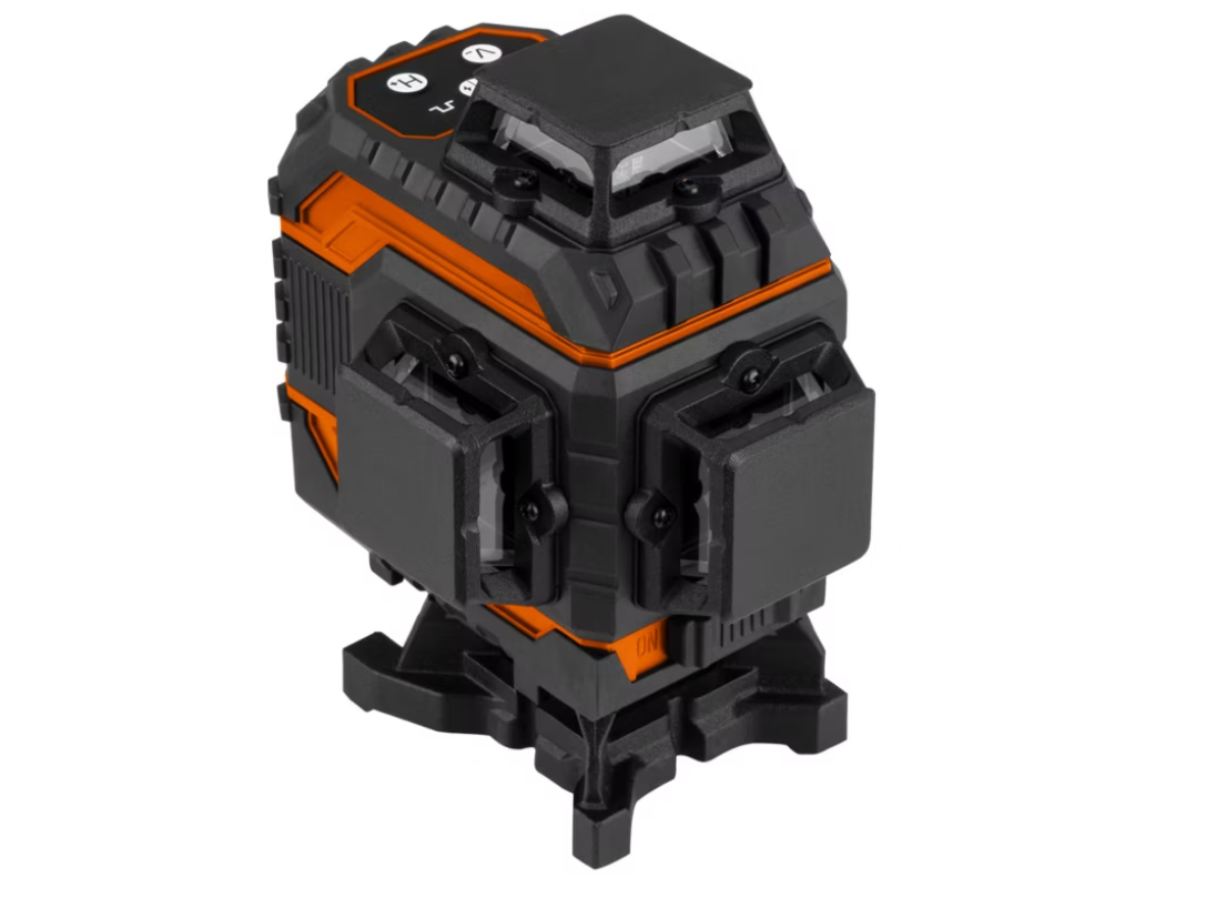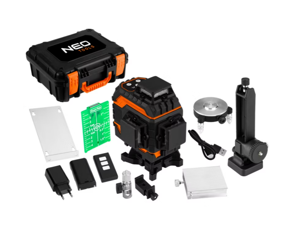 3D-лазер NEO TOOLS, 12 ліній, зелений, футляр для перенесення, цільова дошка, магнітне кріплення, зарядний пристрій 75-140 – це пристрій із зеленим лазерним променем, що забезпечує дальність випромінювання до 25 метрів та точність 1,5 мм/5 метрів. Він має довжину хвилі світла 515 +/- 10 нм та діапазон самонівелювання 3 градуси. Час роботи від літій-іонного акумулятора 3,7 В 4000 мАг становить приблизно 4 години. 3D-лазер NEO TOOLS виготовлений за стандартами класу II та має клас захисту IP43. Потужність лазера < 1 мВт. Лазер проектується у трьох площинах. Комплект включає вертикальну та обертову головку штатива, головку з редуктором, монтажну пластину, дві батареї, пульт дистанційного керування, підйомник, цільову дошку, магнітне кріплення, зарядний пристрій, USB-кабель для заряджання та практичний футляр для перенесення. 3D-лазер NEO TOOLS має функцію фіксації лазера, що дозволяє визначати прямі лінії під будь-яким кутом, та миготливий індикатор лазера, який вказує на неможливість вирівнювання. Продукт також сертифікований CE на відповідність стандарту EN60825-1:2014, що забезпечує безпечну експлуатацію. Його розміри становлять 130 x 90 x 153 мм, а вага — 710 г (без батареї). Цей легкий, багатофункціональний пристрій дозволяє визначати точні лінії. Незамінний для будівельних робіт.